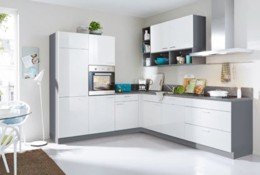 komb. dekoru magnólia vysoký lesk/antracit, prac.doska dekor dub šedý, barová pracovná doska vrát.konzol a dekoračný obklad výklenku sú za príplatok, šírky vyobrazených zostáv 302+120 cm 1.699,-