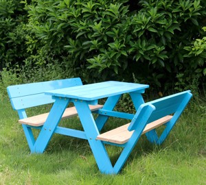 z dvoch lavičiek a stolíka, vyrobený z kvalitného masívneho dreva. Farebné prevedenie biela/prírodná, modrá/ prírodná alebo prírodná/sívá 108x89x50 cm (ŠxHxV)