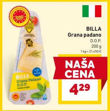 Aktuálnu zľavu na BILLA Grana padano D.O.P. 200 g zistíte jednoducho nastavením Strážca zliav .