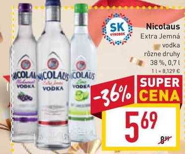 Aktuálnu zľavu na Nicolaus Extra Jemná vodka rôzne druhy 38%, 0,7l zistíte jednoducho nastavením Strážca zliav .