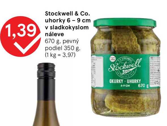 Stockwell & Co. uhorky 6 - 9 cm v sladkokyslom náleve 670 g pevný podiel 350 g
