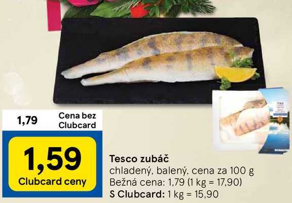 Tesco zubáč, cena za 100 g