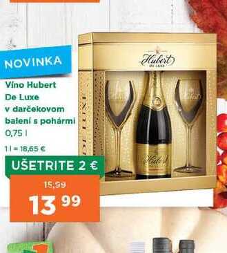 Aktuálnu zľavu na Vino Hubert De Luxe v darčekovom baleni s pohármi 0.75 l zistíte jednoducho nastavením Strážca zliav .