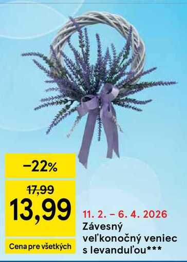 Aktuálnu zľavu na Závesný veľkonočný veniec s levandul'ou zistíte jednoducho nastavením Strážca zliav .