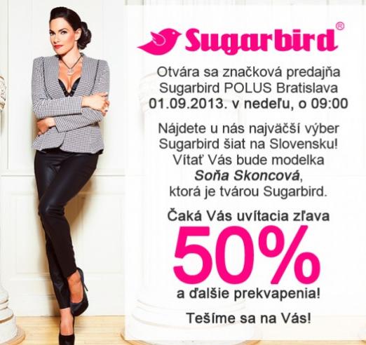 V nedeľu, 1.9.2013 o 9:00 pre vás otvárame novú módnu predajňu Sugarbird. Vítať vás bude modelka Soňa Skoncová a okrem iného vás čaká uvítacia, 50% zľava. Pozrite si ukážku z kolelekcie už teraz a nechajte sa inšpirovať: https://www.facebook.com/pages/Sugarbird-POLUS-Bratislava/358130877623264